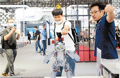 參觀者(中)在2021世界人工智能大會(huì)展會(huì)現(xiàn)場(chǎng)體驗(yàn)體感機(jī)器人玩具。新華社記者 方 喆攝
