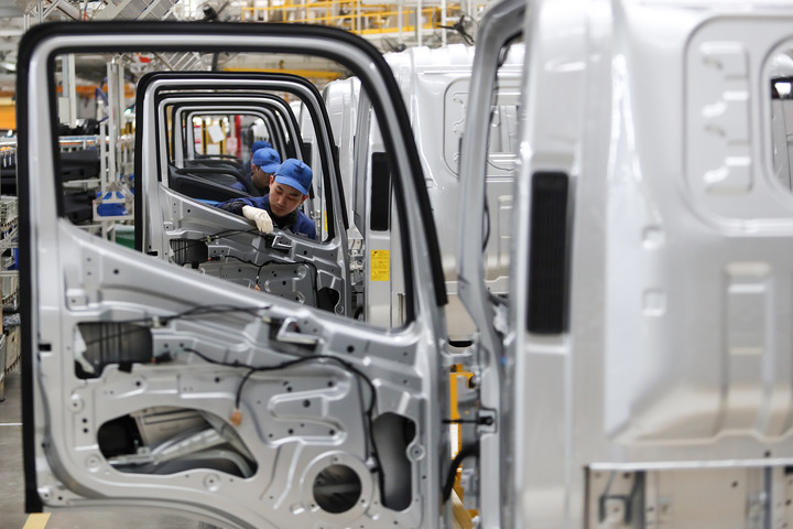2024年1月8日,河南商丘首批地產新能源輕卡車下線,工人在組裝車間工作。新華社發