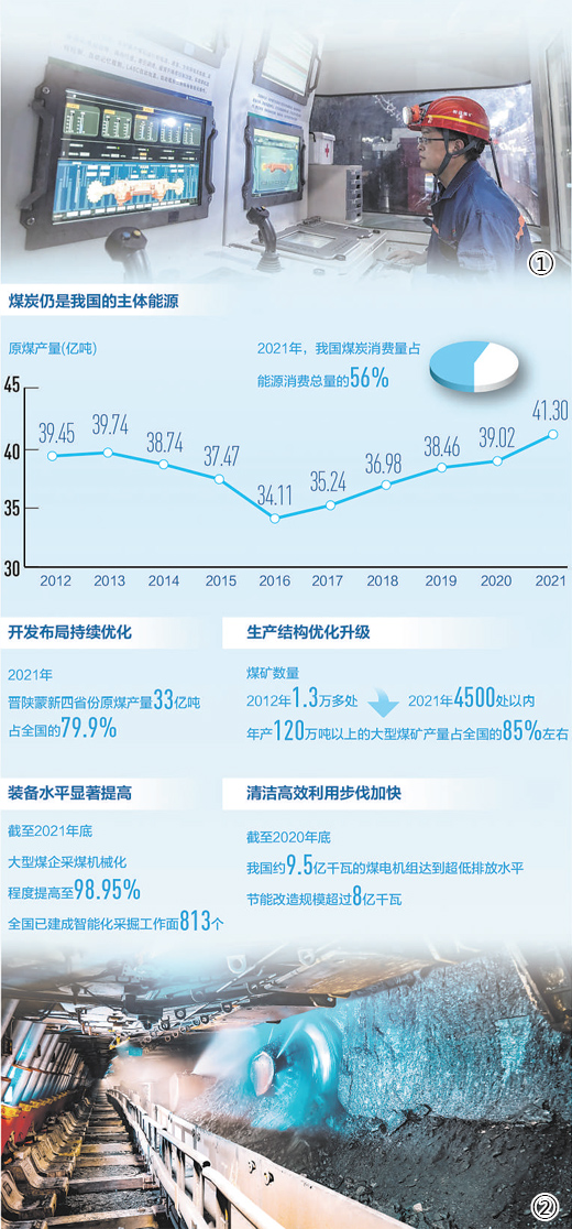 百米深井,一臺滾筒直徑達3.5米的采煤機開采2500噸煤炭;繁忙港口,一臺四翻式翻車機卸載100節火車皮;工業園區,兩臺660兆瓦燃煤機組生產電能132萬千瓦時,滿足6600戶家庭1個月的用電需求……煤炭保障著經濟社會發展和民生用能需求。2021年,我國原煤產量達41.3億噸,煤炭消費量占能源消費總量的56%,煤炭仍是我國的主體能源。