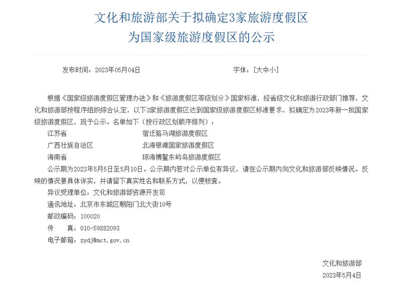 據文旅部消息,根據《國家級旅游度假區管理辦法》和《旅游度假區等級劃分》國家標準,經省級文化和旅游行政部門推薦,文化和旅游部按程序組織綜合認定,以下3家旅游度假區達到國家級旅游度假區標準要求,擬確定為2023年新一批國家級旅游度假區,現予公示。名單如下(按行政區劃順序排列):