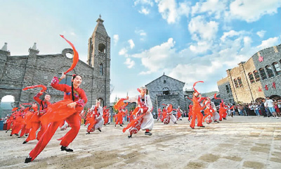在金延安南街教堂廣場前,演員們正在進行花鼓表演。