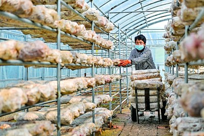 內蒙古自治區呼和浩特市土默特左旗善岱鎮村民在蘑菇大棚內勞作。新華社發
