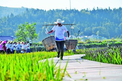 浙江省建德市大同鎮,農民在稻田間參加“挑稻谷接力”趣味比賽。新華社發