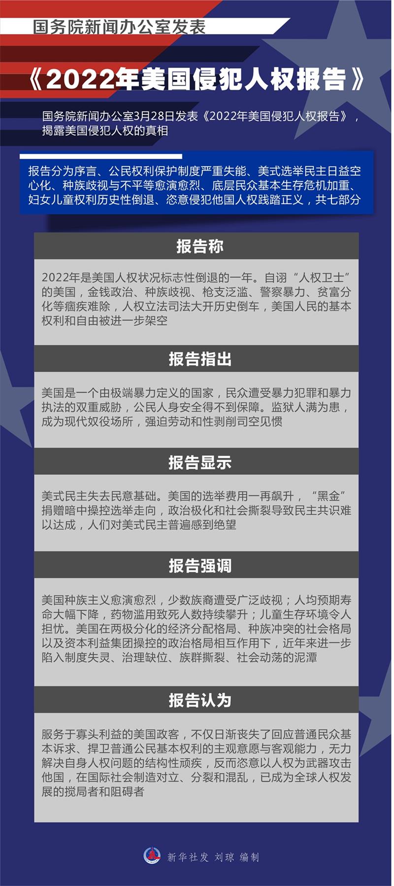 新華社北京3月28日電 國務院新聞辦公室28日發表《2022年美國侵犯人權報告》,揭露美國侵犯人權的真相。