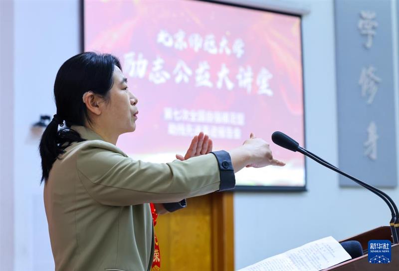 ??北京新生命養(yǎng)老助殘服務(wù)中心主任唐占鑫、武漢理工大學(xué)盲人博士研究生黃鶯、江蘇省東臺市特殊教育學(xué)校高級教師李康、云南民族服飾工藝品創(chuàng)業(yè)者此路恒、山西大學(xué)政治與公共管理學(xué)院團委書記高思恩、清華大學(xué)聽障學(xué)生李堯、電子科技大學(xué)教授徐鵬等7名全國自強模范和全國殘疾人工作先進個人,在北京師范大學(xué)宣講事跡。