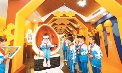 北京市密云區高嶺學校的學生正在奧金達蜜蜂生態科普館VR蛋椅上體驗蜜蜂飛行。賀 勇攝(人民視覺)