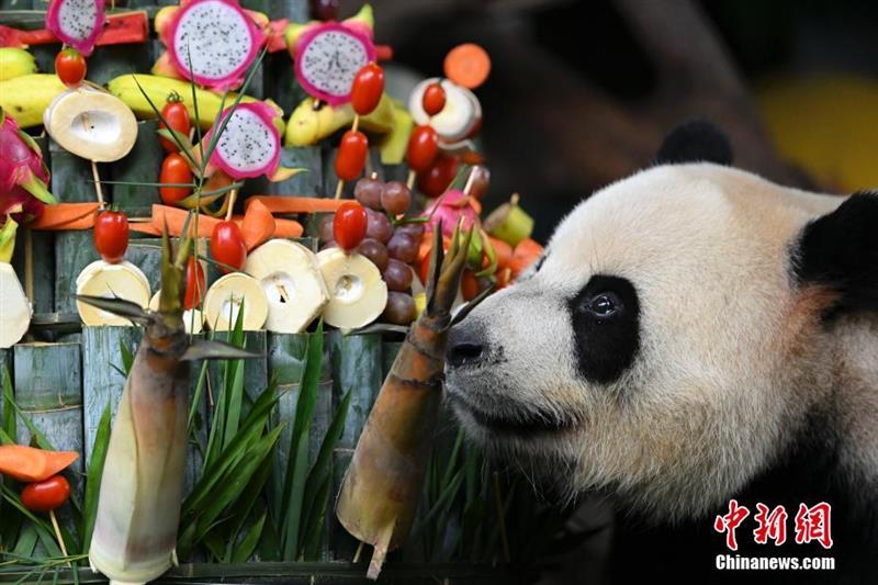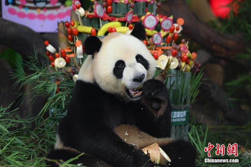 7月29日,在位于廣東省廣州市的長隆野生動物世界內,三胞胎之一的大熊貓“帥帥”品嘗特制生日蛋糕。當日,全球唯一大熊貓三胞胎“萌、帥、酷”迎來6歲生日。