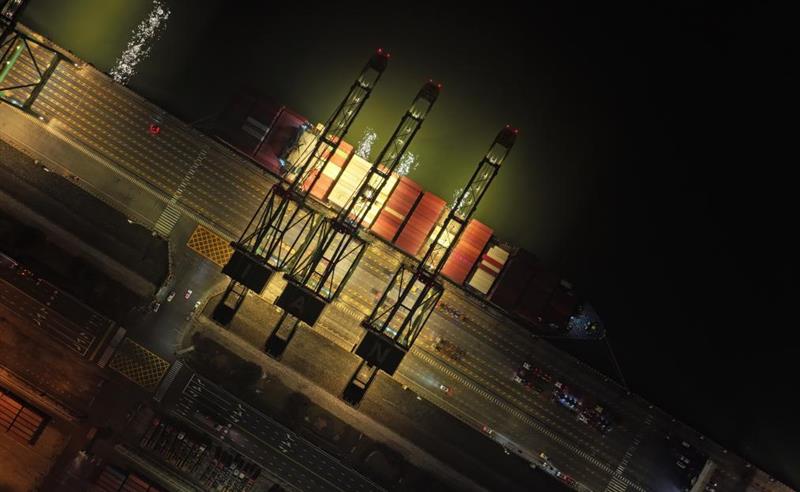 ??2024年1月16日,大型集裝箱班輪“巴赫”號靠泊在天津港太平洋國際集裝箱碼頭(無人機照片)。新華社記者 趙子碩 攝