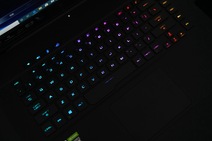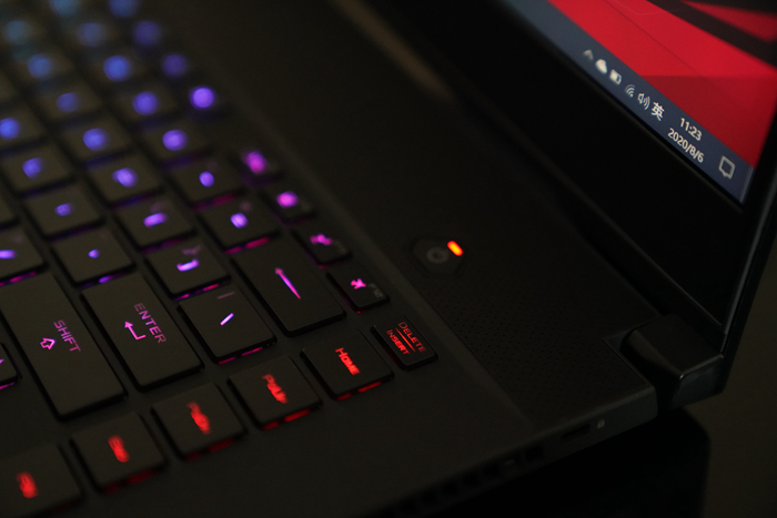 與傳統筆記本不一樣的是,游戲本的按鍵布局要更為復雜。第一次上手會有不習慣的感覺。不過在上手了一周后就能慢慢習慣。值得一提的是,鍵盤上方增設了四個功能鍵,分別是音量加、減、靜音和ROG鍵,可以一鍵呼出Armoury Crate界面。對于游戲玩家來說都是非常方便的設計。