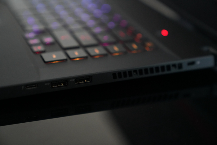 接口方面,ROG的冰刃4新銳比較豐富。左側為電源輸入接口、網線接口、HDMI 2.0b接口、USB 3.2 Type-A Gen 2 10Gbps接口,3.5毫米麥克風和耳麥二合一接口。右側為雷電3接口,集成DisplayPort 1.4與PD充電,兩個USB 3.2 Type-A Gen 1 5Gbps接口。機身尾部與側面有4個出風口,可以完美解決散熱的問題。