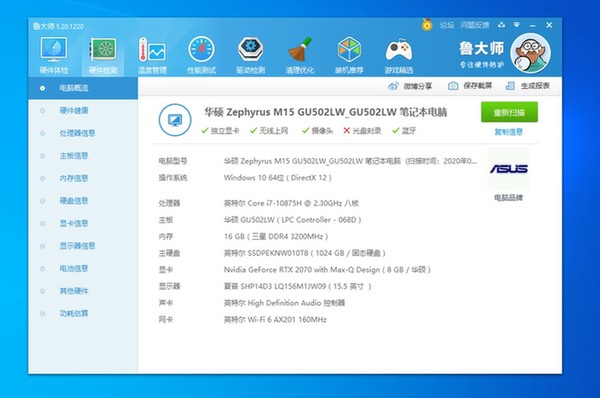 作為一款游戲筆記本,除了有炫酷的外觀外,強勁的性能也是“必備”。ROG的冰刃4新銳搭載的硬件可以說相當強勁。以我體驗的型號為例,諸如8GB的NVIDIA GeForce RTX 2070 Max-Q顯卡、16GB的DDR4 3200MHz內存、1TB的M.2 NVMe PCIe 3.0 SSD這些耳熟能詳的強勁配置都是組成ROG的冰刃4新銳的重要成員。值得一提的是,主處理器方面搭載了最新的英特爾第十代酷睿i7-10875H。這是一顆8核16線程的CPU,單核最高可以睿頻至5.1GHz。