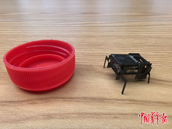 這只“甲蟲”機器人比礦泉水瓶蓋還小。中青報·中青網記者 張渺/攝
