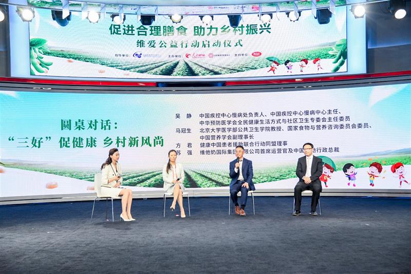 圓桌論壇環節,中國疾控中心慢病處負責人、中國疾控中心慢病中心主任吳靜,北京大學醫學部公共衛生學院教授、國家食物與營養咨詢委員會委員馬冠生,健康中國患者援助聯合行動同盟理事方君,維他奶國際集團有限公司首席運營官及中國內地行政總裁蘇強共同圍繞“營養促健康 鄉村新風尚”展開交流分享,助力營養健康事業與鄉村振興的有效銜接,推動形成健康生活鄉村新風尚。