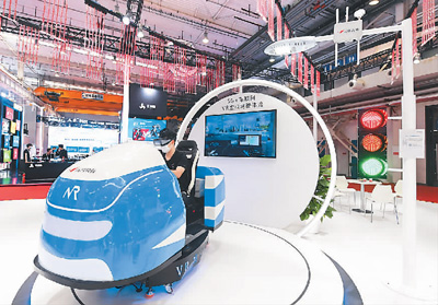 參觀者在2021世界5G大會展覽現(xiàn)場體驗5G+車聯(lián)網(wǎng)VR虛擬駕駛。 新華社記者 任 超攝