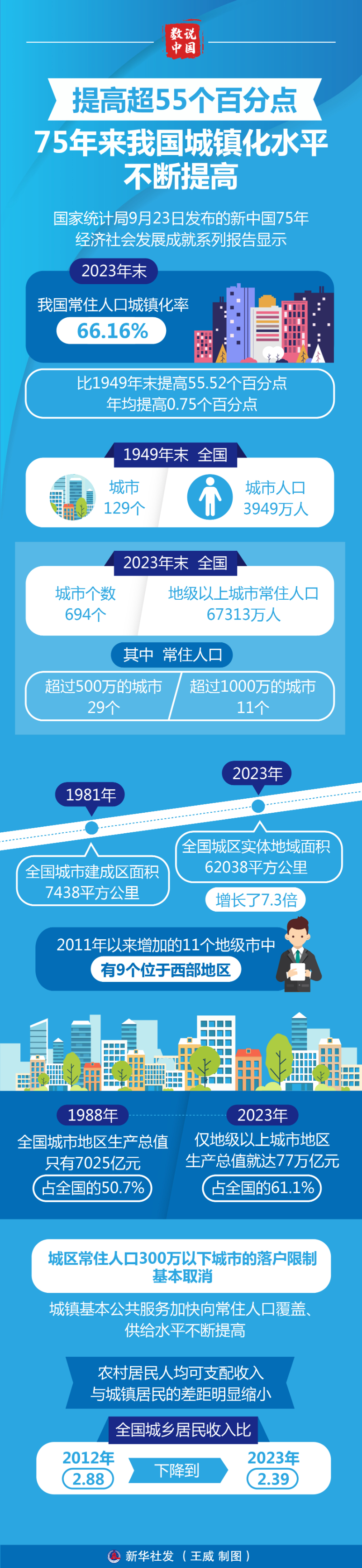 ??新華社北京9月23日電(記者潘潔、張曉潔)國(guó)家統(tǒng)計(jì)局23日發(fā)布的新中國(guó)75年經(jīng)濟(jì)社會(huì)發(fā)展成就系列報(bào)告顯示,2023年末我國(guó)常住人口城鎮(zhèn)化率達(dá)66.16%,比1949年末提高55.52個(gè)百分點(diǎn),年均提高0.75個(gè)百分點(diǎn)。