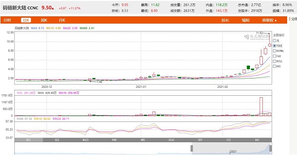 在國(guó)際上,日前,從納斯達(dá)克傳來(lái)消息,納斯達(dá)克上市公司碼鏈新大陸公司(CCNC),自去年10月中旬放量大漲,成為納斯達(dá)克明星之后,經(jīng)過(guò)這幾個(gè)月的整理,最高超過(guò)11美元,股價(jià)放量大漲將近5倍。近期碼鏈新大陸宣布完成2500萬(wàn)美元私募融資與宣布1萬(wàn)臺(tái)比特幣礦機(jī)資產(chǎn)收購(gòu)兩大利好。