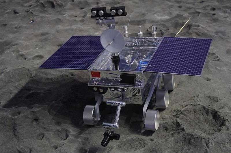 航展上的“玉兔二號”月球巡視車模型。此前的五星紅旗,都是以“噴涂”形式繪制在了航天設(shè)備表面