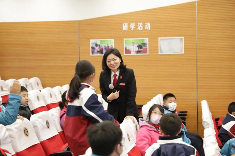 圖為黃文娟在德培小學與同學們互動。寧波市中級人民法院供圖