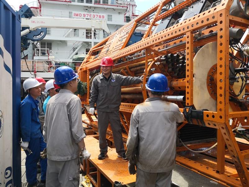 ??萬步炎(右二)在科考船上為“海牛Ⅱ號”團隊講解鉆機設計原理(2021年5月1日攝)。新華社發(金永平 攝)