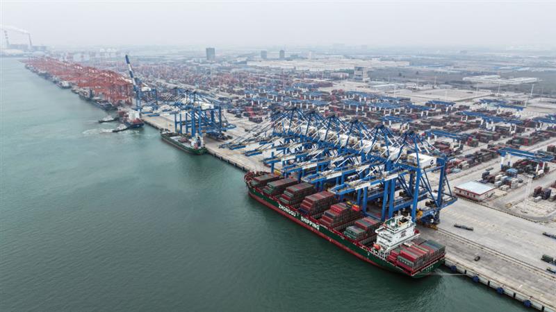 ??在廣西欽州港碼頭,多艘海輪在卸貨(2024年3月1日攝,無人機照片)。新華社記者 張愛林 攝