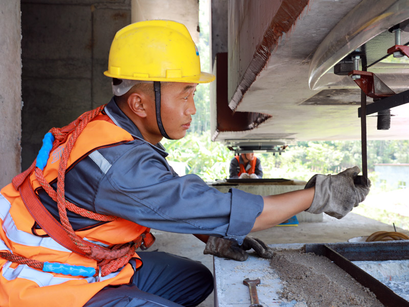 施工人員在對澄江雙線特大橋最后一榀箱梁支座高度進(jìn)行確認(rèn)。莫小斌攝