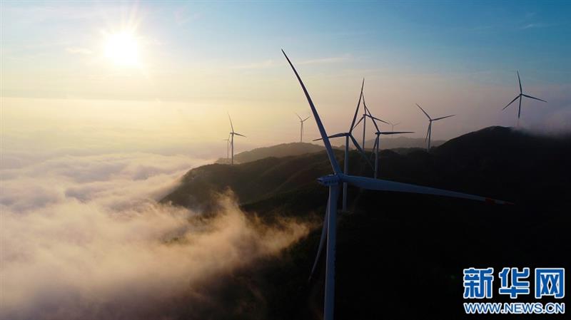 一臺臺風力發(fā)電機矗立在群山之巔,云霧繚繞,美不勝收。新華網(wǎng)發(fā) 鄧龍華 攝