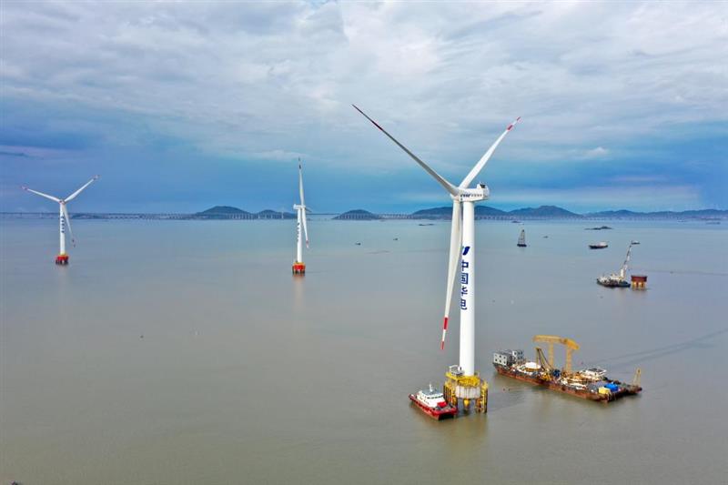 這是華電福清海壇海峽海上風電項目首臺海上風電主控系統國產化機組(右)(2021年5月28日攝,無人機照片)。新華社記者 姜克紅 攝