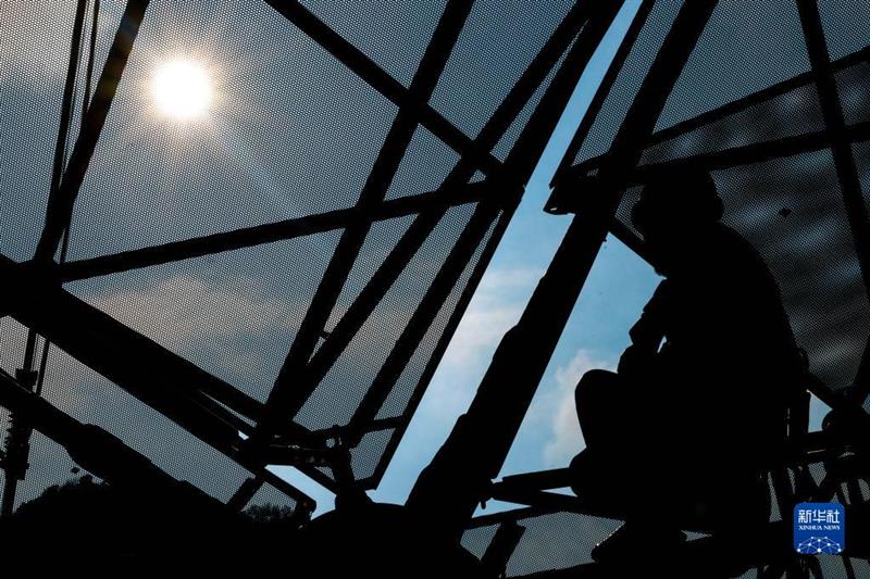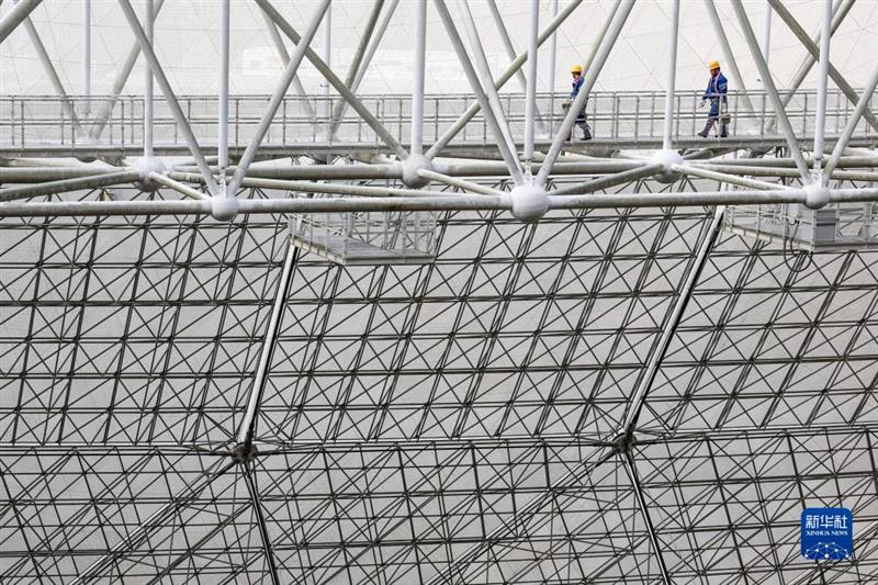 2月13日,工作人員從“中國天眼”的圈梁上經過(維護保養期間拍攝)。新華社記者 歐東衢 攝